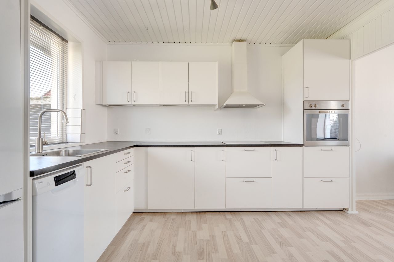 Boligen er indrettet med en stor og lys stue i åben forbindelse med det nyere IKEA-køkken, hvor du har alt i hårde hvidevarer og et skønt kig udover haven. Når du træder indenfor bydes du velkommen af en rummelig entré, der giver adgang til føromtalte køkken og stue, samt et vaskerum, hvor du har mulighed for at lave et ekstra toilet, hvis dette synes nødvendigt. I entréen finder du også trappen til 1. sal, som indeholder badeværelse og to værelser, hvor det ene er indrettet med rigtig god skabsplads. I huset er der et lille kælderrum med adgang til krybekælderen under resten af huset.