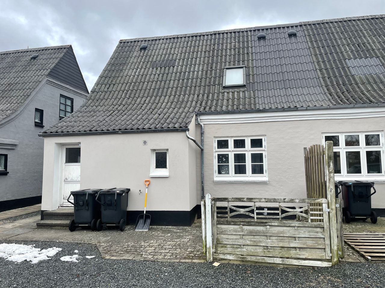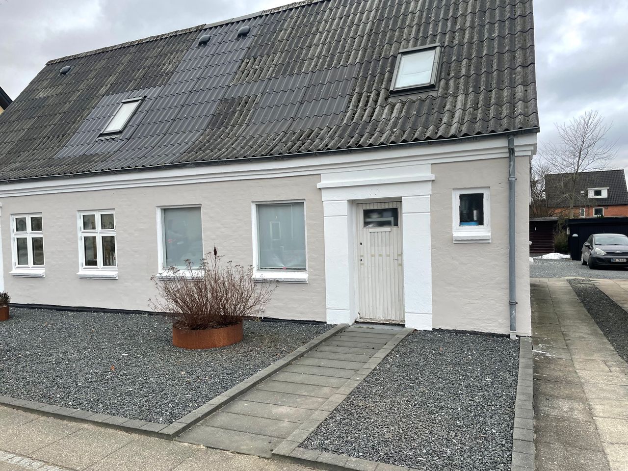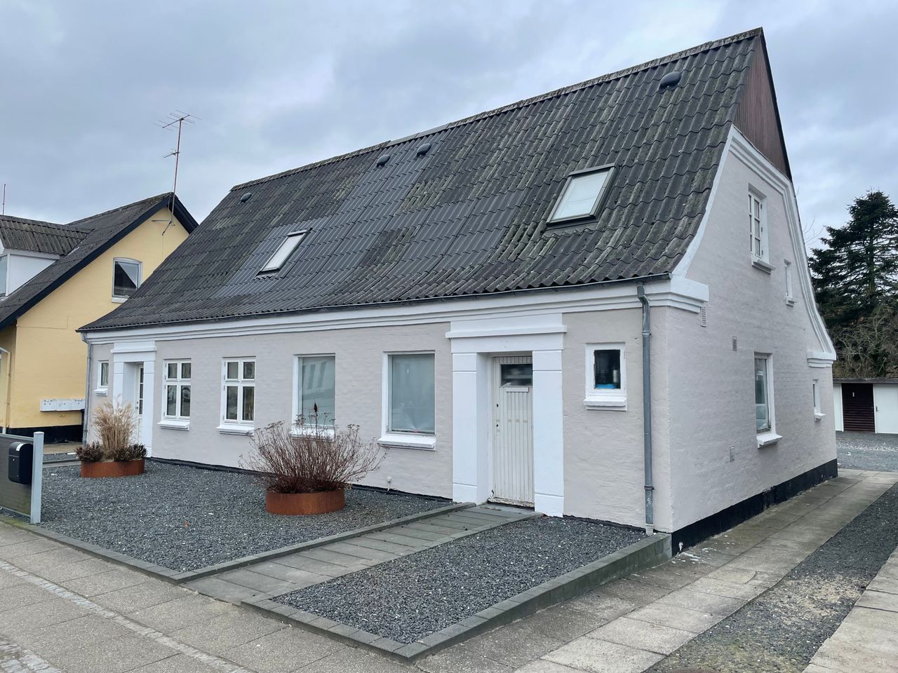 Velbeliggende rækkehus, delvist restaureret. Der er malet murværk og lille del er netpudset, der er eternittag.