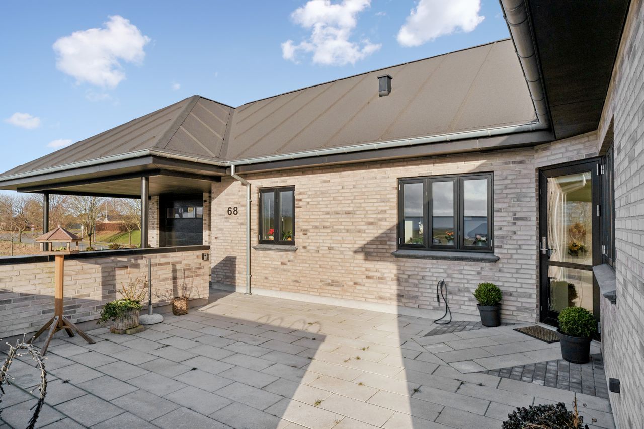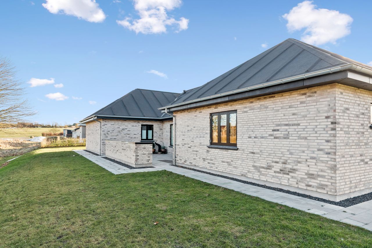 Virkelig lækker, velbeliggende og veludført vinkelbygget villa, opført i gråmalerede mursten og med listetækket tag med tagpap på saddeltag med valmede gavle. Der er sort eternitplader på underbeklædning og sternbrædder. Sorte træ-alu. termovinduer overalt. Så næsten ingen vedligeholdelse på denne villa.