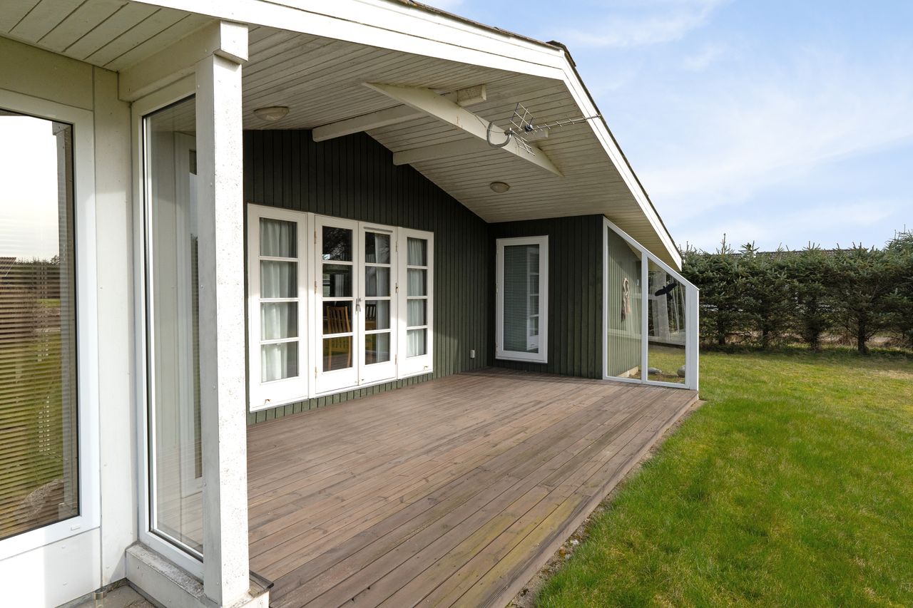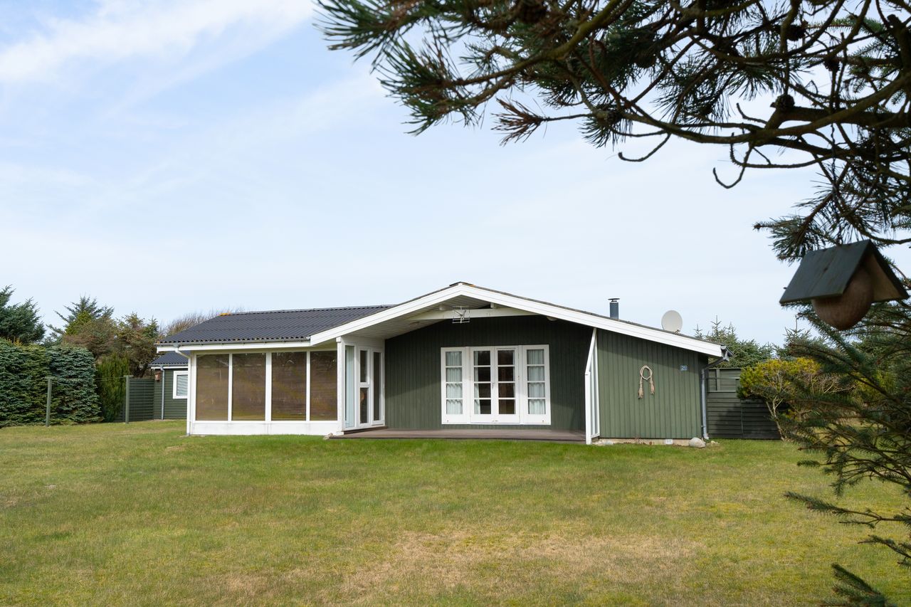 Vinkelbygget sommerhus, træbeklædt og malet i grøn farve. Der er eternittag. Der er gode termovinduer i trærammer og i tilbygningen, som er bygget i 1995, er der lavet ny entre og udestue. I udestuen er der plast-termovinduer og udgang til skøn terrasse/veranda, der vender mod syd.