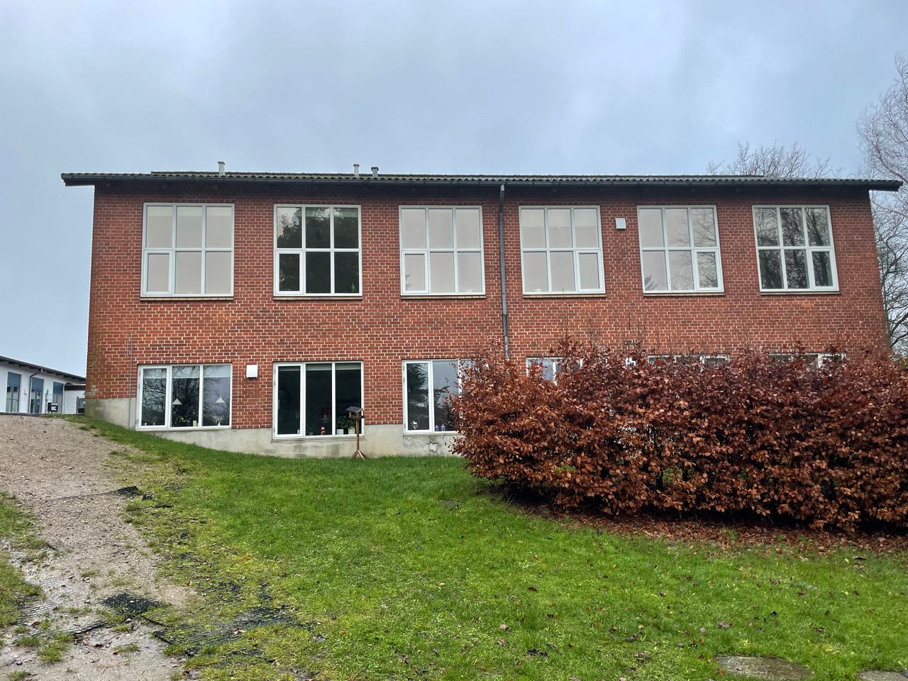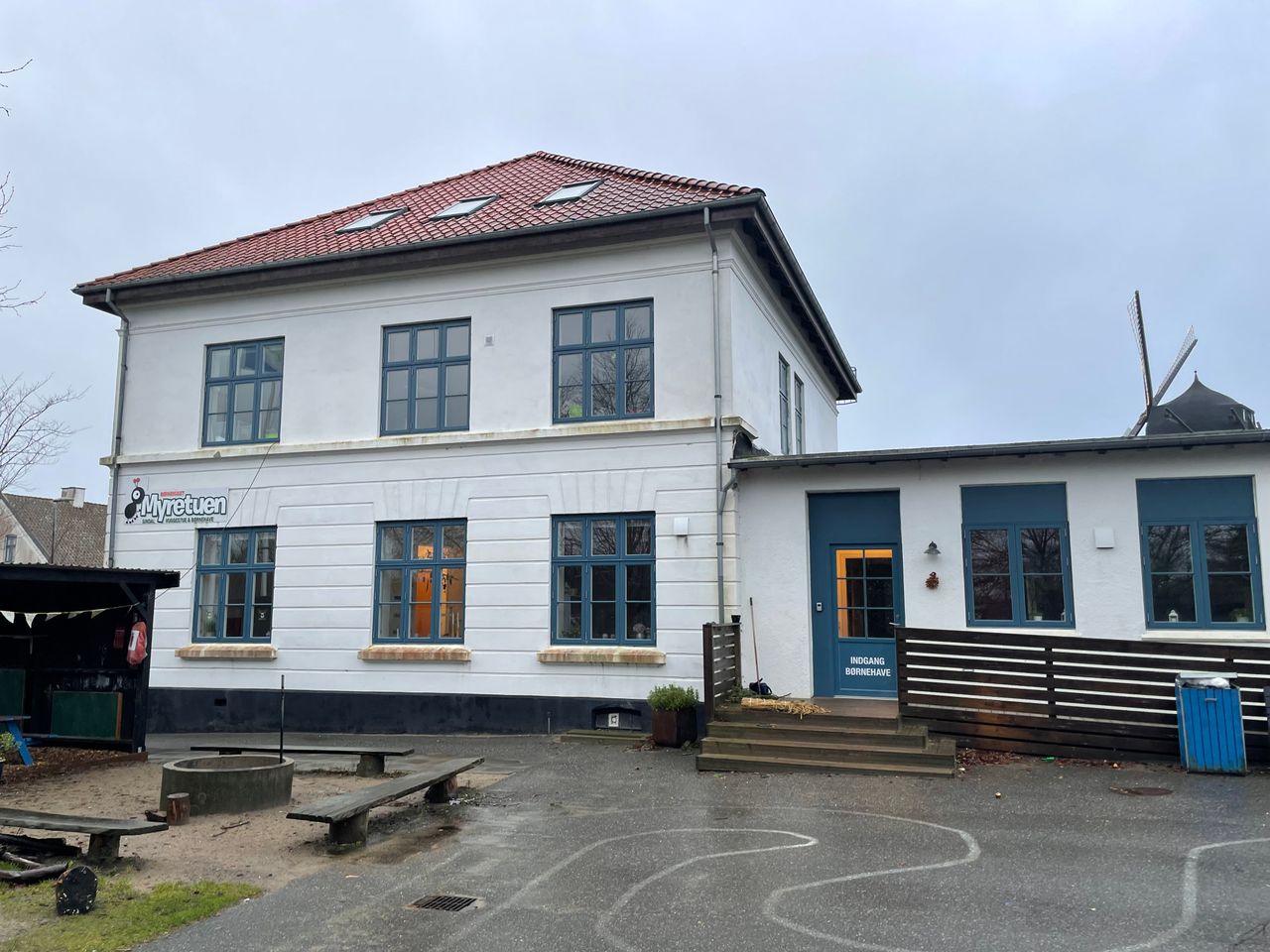 Møllebakken 5, Sindal: Separat bygning i røde sten og med eternittag har tillige nye træ-alu vinduer fra 2020 i størstedelen af huset. Denne bygning har oprindeligt været bygget til klasseværelser for realskoleklasser på 1. sal samt faglokaler i stueplan. Nu er bygningen indrettet for den vuggestue, der har haft til huse der en del år og indeholder: Entre, teknikrum, 2 toiletter og vaskerum, 1 toilet, køkken, garderobe, stor stue, 2 rum.