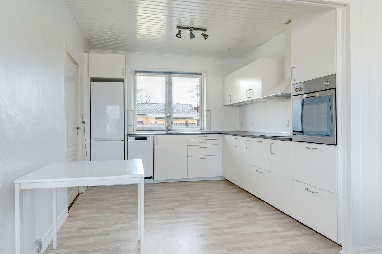 Boligen er indrettet med en stor og lys stue i åben forbindelse med det nyere IKEA-køkken, hvor du har alt i hårde hvidevarer og et skønt kig udover haven. Når du træder indenfor bydes du velkommen af en rummelig entré, der giver adgang til føromtalte køkken og stue, samt et vaskerum, hvor du har mulighed for at lave et ekstra toilet, hvis dette synes nødvendigt. I entréen finder du også trappen til 1. sal, som indeholder badeværelse og to værelser, hvor det ene er indrettet med rigtig god skabsplads. I huset er der et lille kælderrum med adgang til krybekælderen under resten af huset.