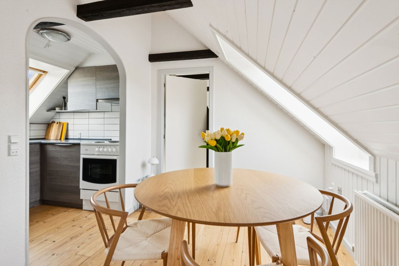 Virkelig flot og hyggelig ejerlejlighed på 2. sal i markant byejendom i Hjørring Centrum, som er med pudset og gulmalet murværk, rødt vingetegltag. Gode termovinduer i trærammer. Det er en virkelig lys og flot ejerlejlighed med lysindfald fra både syd, øst og vest, der er loft til kip med synlige hanebånd. Alt er malet i lyse og venlige farver og der er nyere køkken og hvidevarer.