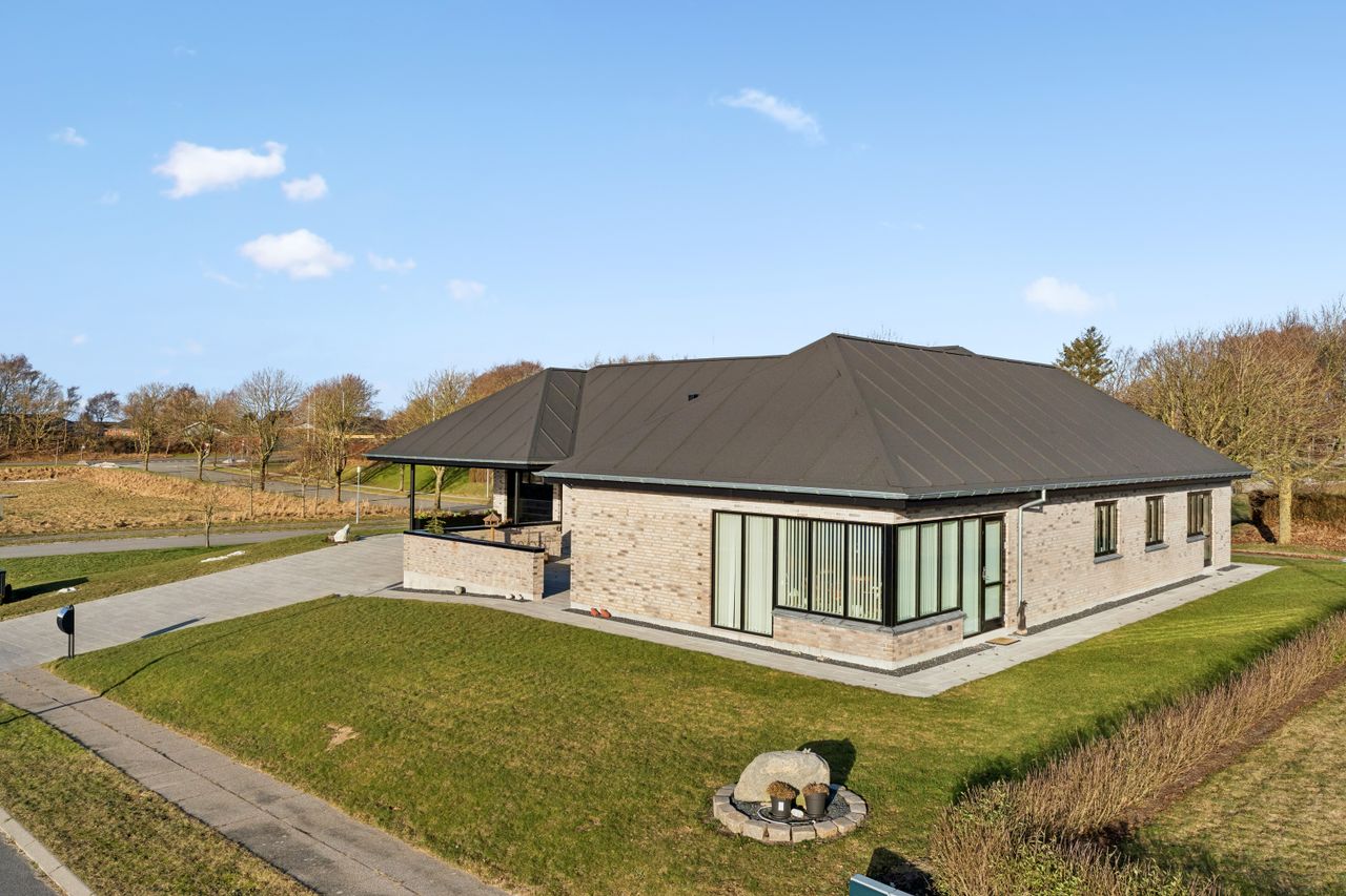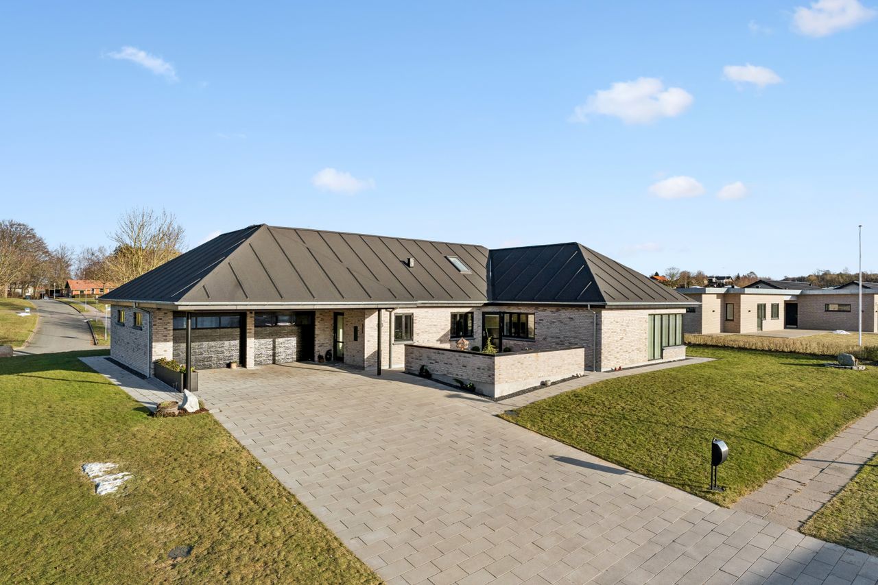 Virkelig lækker, velbeliggende og veludført vinkelbygget villa, opført i gråmalerede mursten og med listetækket tag med tagpap på saddeltag med valmede gavle. Der er sort eternitplader på underbeklædning og sternbrædder. Sorte træ-alu. termovinduer overalt. Så næsten ingen vedligeholdelse på denne villa.