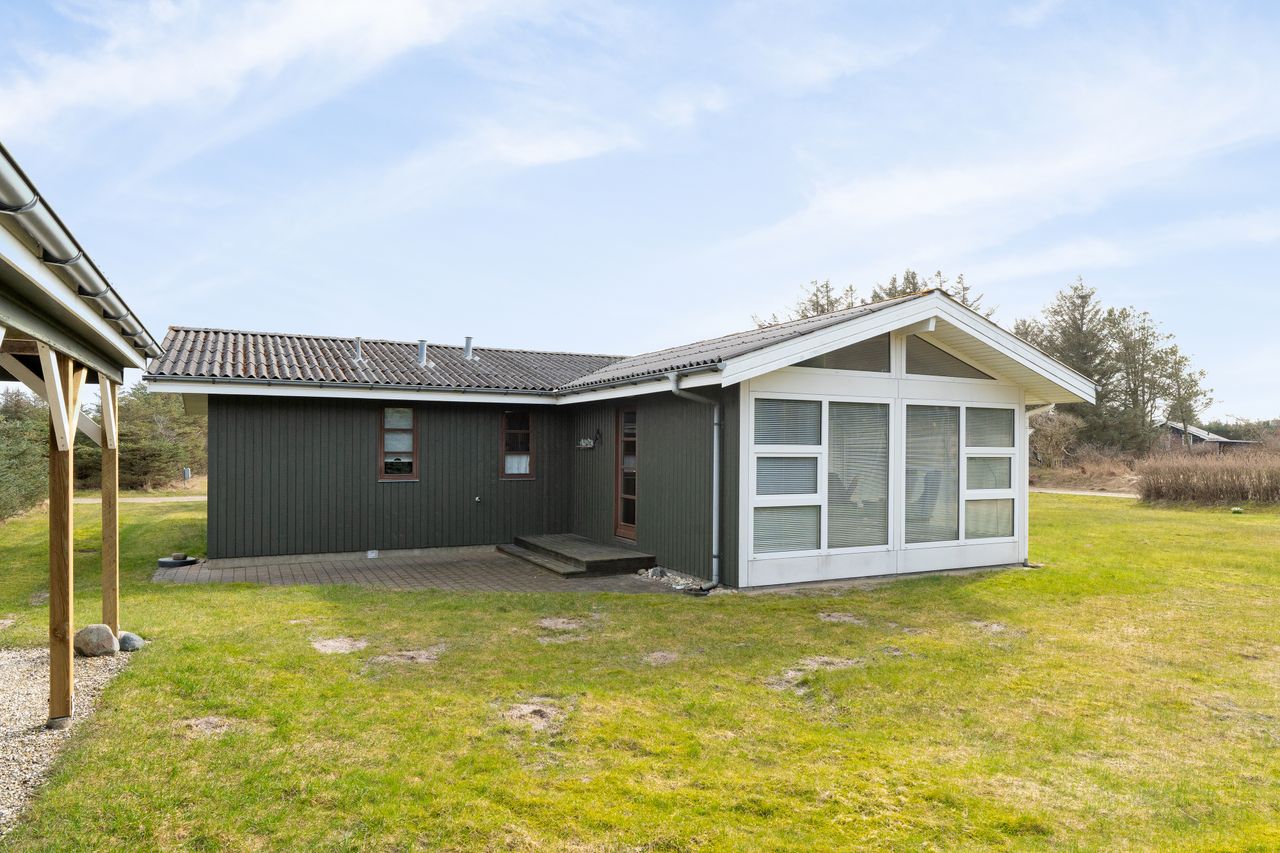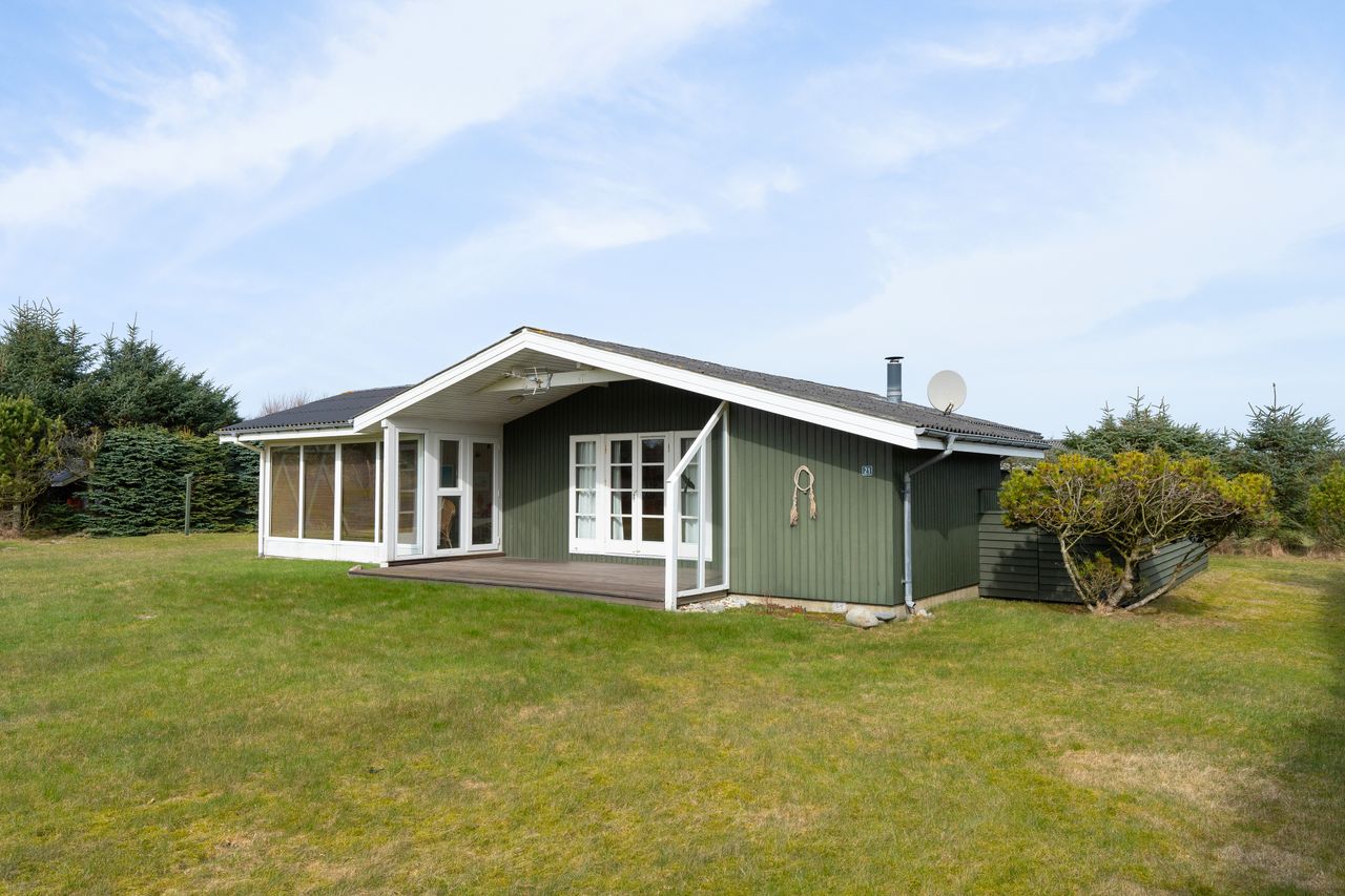 Vinkelbygget sommerhus, træbeklædt og malet i grøn farve. Der er eternittag. Der er gode termovinduer i trærammer og i tilbygningen, som er bygget i 1995, er der lavet ny entre og udestue. I udestuen er der plast-termovinduer og udgang til skøn terrasse/veranda, der vender mod syd.