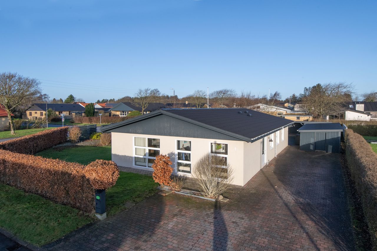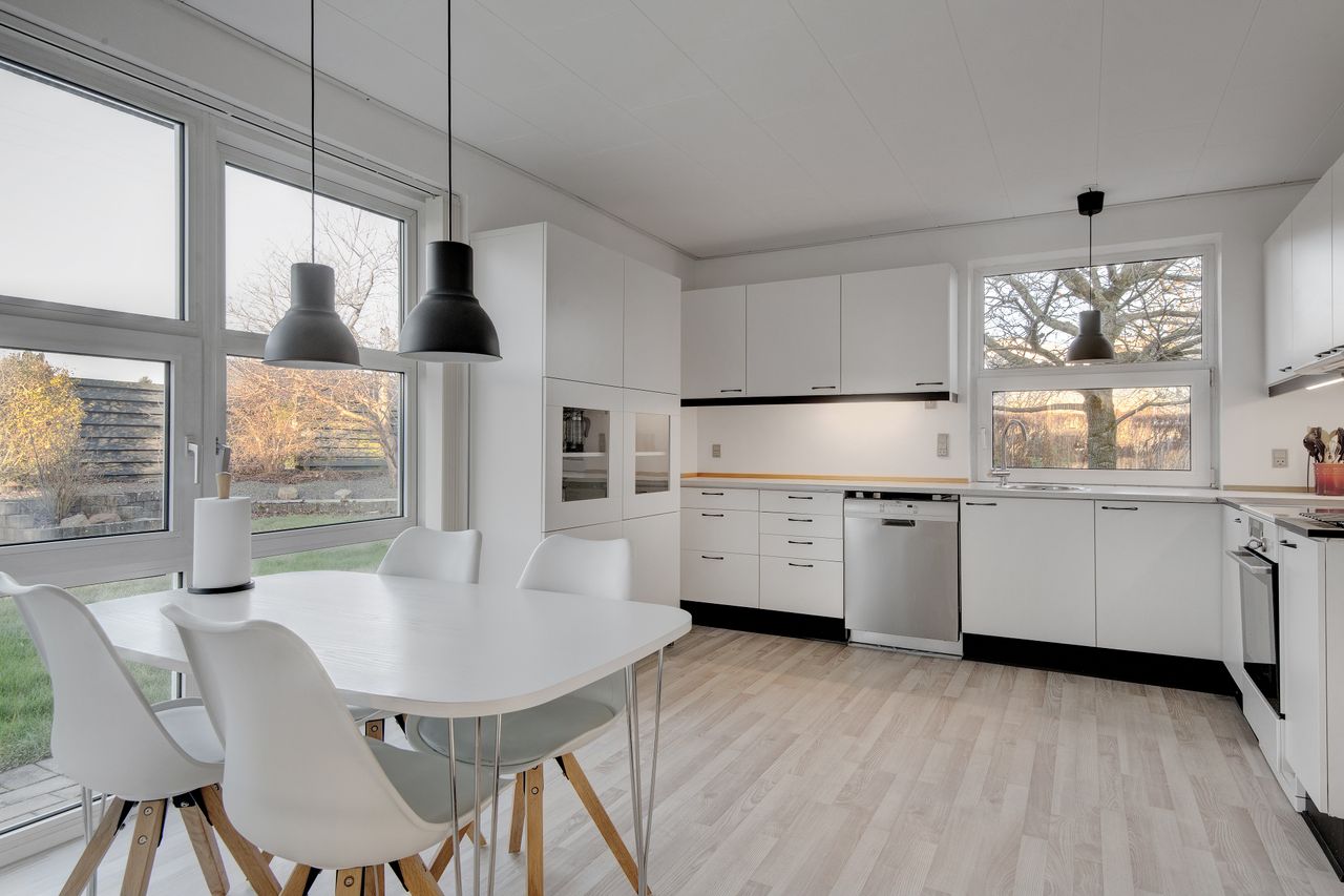 Når du træder indenfor, mødes du af en entré, med god plads til sko og overtøj. Her har du også adgang til de første to værelser, som er opdelt med en let væg, hvilket giver mulighed for at lægge værelserne sammen, såfremt et større værelse ønskes. Fra entréen føres du videre til en fordelingsgang, der giver adgang til endnu et værelse, et badeværelse med bruseniche og gulvvarme, og husets soveværelse, som har en rigtig god størrelse og 3 store indbyggede skabe. Fra soveværelset er der dør ind til husets andet badeværelse, der ligesom det første, er med bruseniche og gulvvarme. Tilbage i fordelingsgangen, har du også adgang til et skønt bryggers, med håndvask, plads til vaskemaskine og tørretumbler samt installationsrum med bl.a. inverter til solcelleanlægget og varmeveksler til fjernvarmen. Fra bryggerset har du også dør ud til haven og dør ind til køkkenet, hvor du bestemt kan få mange timer til at gå, med kreering af skønne retter, eller blot at nyde udsigten til haven igennem det store vinduesparti, hvor der også er en dør ud til den vestlige del af haven. Fra køkkenet er der videre adgang til den store stue igennem franske døre, der virkelig forbinder køkken og stue godt. Stuen har et fantastisk lysindfald igennem de store vinduer mod vest og syd. Dette giver et rum, hvor der er de ideelle forudsætninger for at samle familien, uanset størrelse. Væggen mellem køkken og stue er ikke bærende, så ønsker man et stort køkken-alrum, kan dette nemt klares. Fra stuen er der en dør, der igen fører dig ud til entré og fordelingsgang.